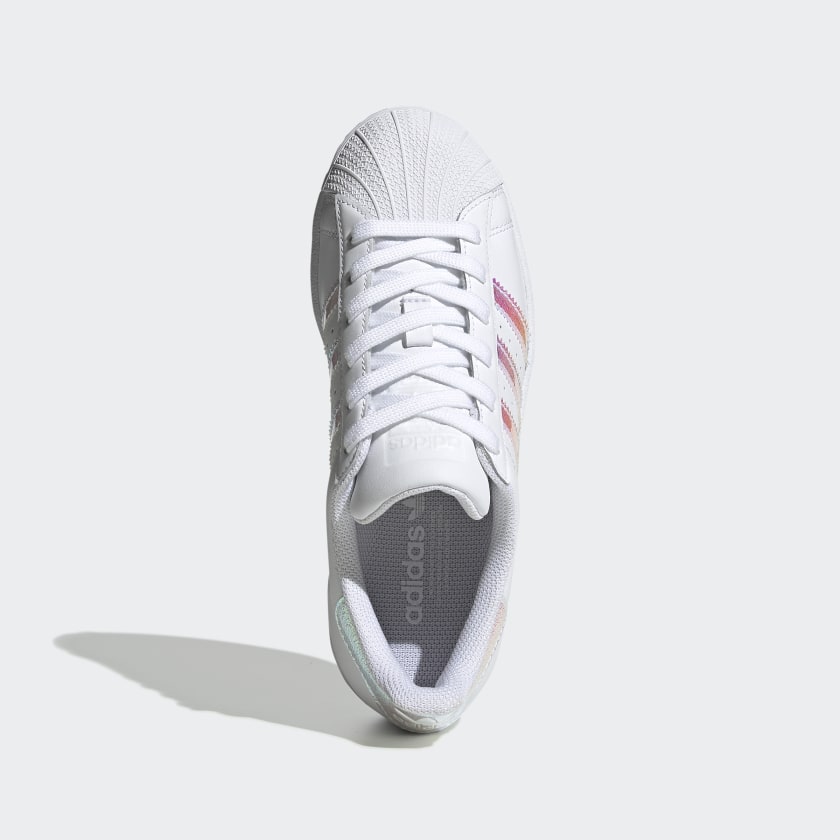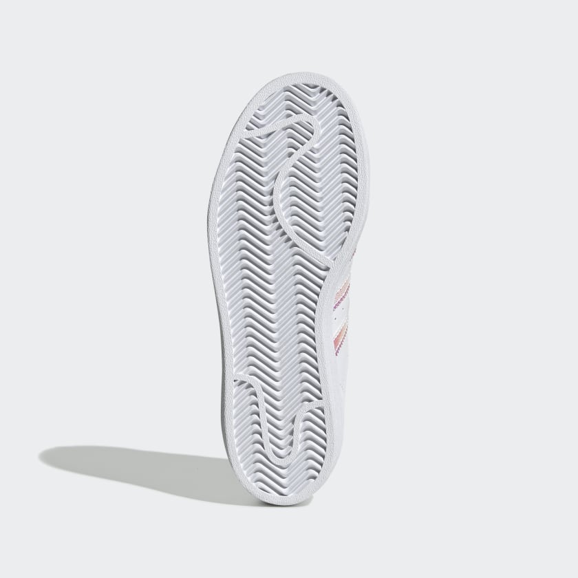 The adidas Superstar trainer came to play. Fifty years later, it’s still on top. These juniors’ shoes show off a flashy new look with iridescent 3-Stripes and heel tabs on the leather upper. They’re capped off with an iconic rubber shell toe.